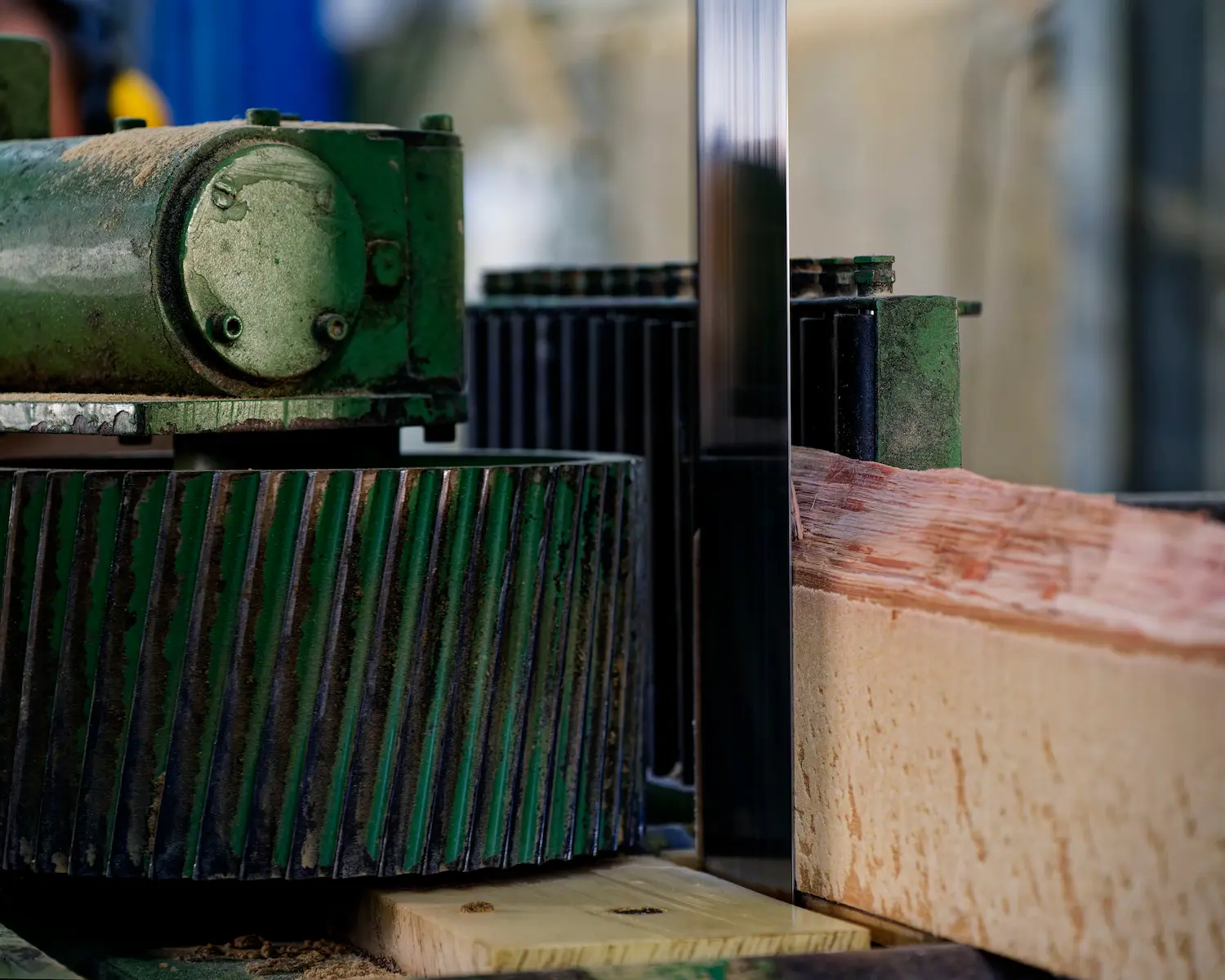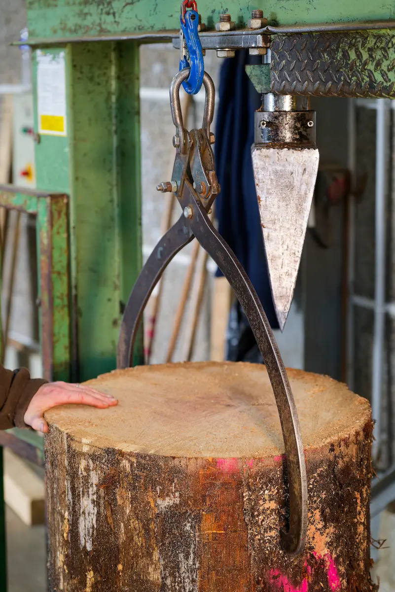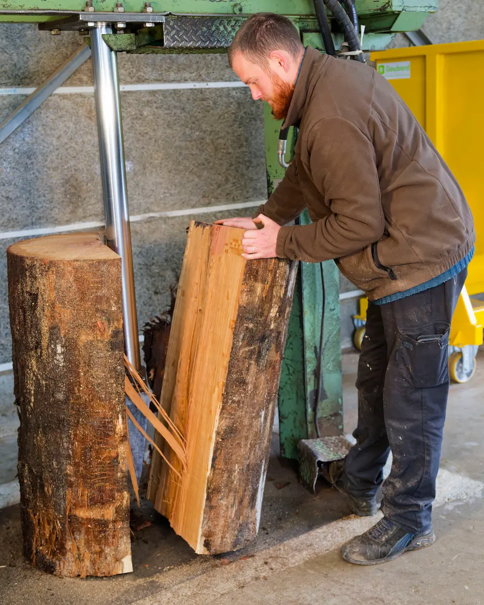 Chaque grume est d’abord mesurée, puis tronçonnée avec précision avant d’être fendue. Chez nous, cette fente reste traditionnelle.